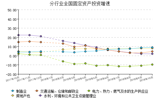 分行业来看:房地产业累计投资增速增长8个百分点;水利、环境和公共设施投资增速增长2个百分点;交通运输、仓储和邮政业投资增速增长5个百分点;制造业投资增速增长9个百分点。