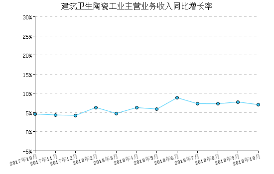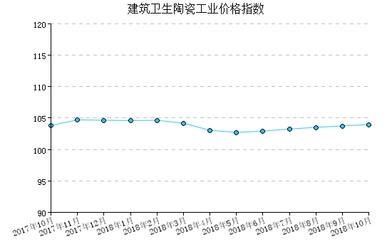 2018年10月,建筑卫生陶瓷工业产品出厂价格指数为103.97,比上月上涨0.21%,比去年同月上涨0.15%,一月至本月平均比去年同期上涨0.09%。
