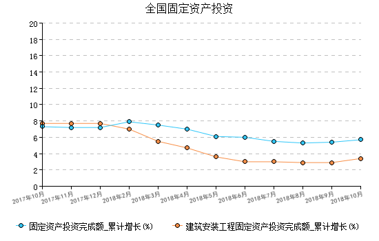 2018年10月全国固定资产投资累计增速增长5.7%,其中建筑安装工程投资累计增速增长3.4%。