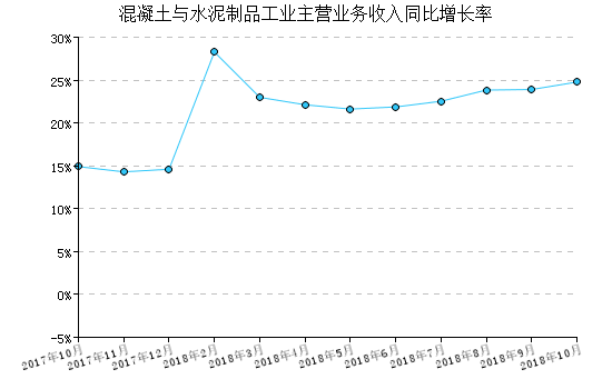 2018年10月,混凝土与水泥制品工业产品出厂价格指数为129.20,比上月上涨1.29%,比去年同月上涨14.55%,一月至本月平均比去年同期上涨16.79%。