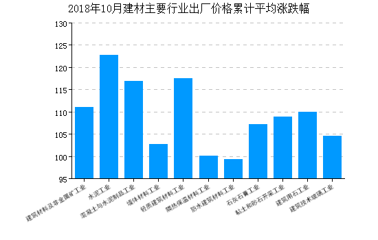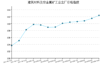 2018年10月,建材价格指数为112.38,比上月上涨0.79%,比去年同月上涨8.44%,一月至本月平均比去年同期上涨10.65%。 价格指数比上月上涨的行业有:水泥工业、混凝土与水泥制品工业、粘土和砂石开采工业、建筑用石工业、建筑技术玻璃工业、;价格指数比上月下降的行业有墙体材料工业、轻质建筑材料工业、隔热保温材料工业、防水建筑材料工业、石灰石膏工业、。