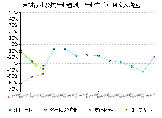 2018年10月规模以上工业增加值同比增长5.90%,累计增长6.40%。 跟其他工业行业相比,建材行业增加值增速低于设备制造、电器机械和器材制造、电力、热力生产及供应等行业,高于化学原料和化学品制造、黑色金属冶炼和压延、有所金属冶炼和压延等行业。