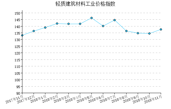 2018年11月,轻质建筑材料工业产品出厂价格指数为137.58,比上月上涨2.29%,比去年同月上涨3.31%,一月至本月平均比去年同期上涨15.95%。 图 1:轻质建筑材料工业产品出厂价格指数