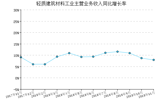 本月全国轻质建筑材料工业产量同比去年同月增长4.16%,累计增速比上月增长9.41%。