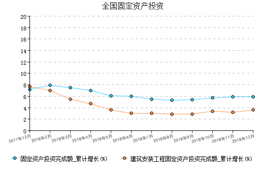 2018年12月全国固定资产投资累计增速增长5.9%,其中建筑安装工程投资累计增速增长3.6%。