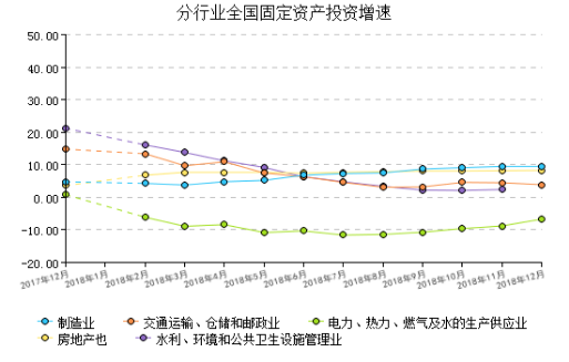 分行业来看:房地产业累计投资增速增长8个百分点;水利、环境和公共设施投资增速保持持平个百分点;交通运输、仓储和邮政业投资增速增长4个百分点;制造业投资增速增长10个百分点。