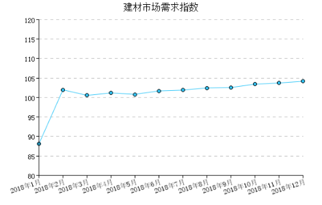 2018年12月,建材市场需求指数为104.17,比上月增加0.43,比去年同月增加3.38%。