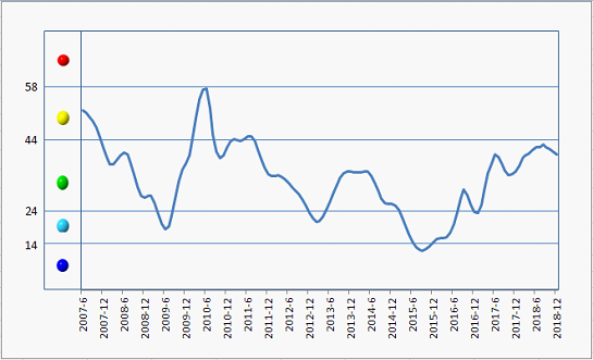 由中色钨钼行业月度景气信号灯(见图2)可见,2018年12月,在构成钨钼行业景气指数的9个指标中,钨钼固定资产月投资额1个指标处于“偏热”区间,钨钼价格指数、M2、钨钼出口额指数、硬质合金产量、粗钢产量、生产指数、钨钼企业主营业务收入、钨钼企业利润总额8个指标处于“正常”区间,没有处于“过冷”、“偏冷”、“过热”空间的指标。值得注意的是,钨钼价格指数从今年4月份开始持续下降,12月份为钨钼价格指数为21.2,已处于“正常”区间中部;钨钼出口额指数从今年10月份开始持续下降,12月份钨钼出口额指数为95.4,已进入“正常”区间;钨钼固定资产投资额指数今年以来持续上升,12月份钨钼固定资产投资额指数为223.8,已接近“过热”区间下限值。
