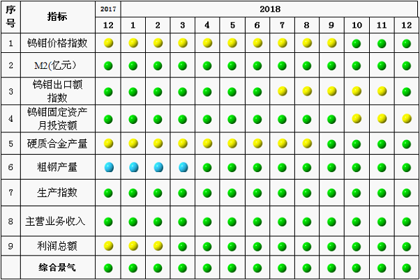 4、综合景气指数反映当前钨钼行业发展景气程度。景气灯号图把钨钼行业经济运行状态分为5个级别,“红灯”表示经济过热,“黄灯”表示经济偏热,“绿灯”表示经济运行正常,“浅蓝灯”表示经济偏冷,“蓝灯”表示经济过冷。对单项指标灯号赋予不同的权重,将其汇总而成的综合景气指数也同样由5个灯区显示。