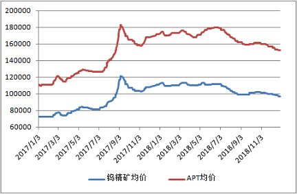 (1)价格走势:2018年12月,国内钨精矿均价9.8万元/吨,同比下降11.3%;APT均价15.4万元/吨,同比下降9.8%。自9月开始,2018年月平均价格已经低于2017年同期。2018年钨精矿最高价格11.4万元/吨,出现在1月初和3月中旬,最低价格9.6万元/吨,出现在12月底;APT最高价格18.2万元/吨,最低价格15.1万元/吨。2018年度钨市场上半年维持上涨趋势,下半年则截然相反,持续下跌。第三季度是传统的需求淡季,第四季度也没有出现需求旺盛的局面,而且自第三季度开始APT冶炼厂陆续复产,供应相对宽松,市场仅仅依靠钨精矿成本支撑,价格持续下降。