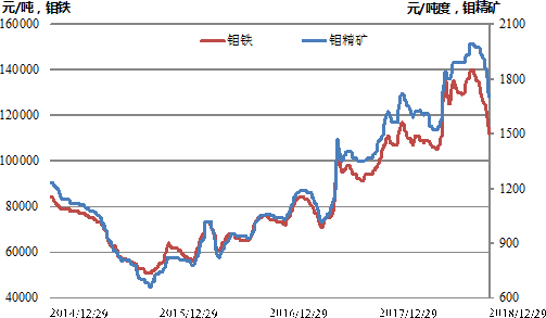 2018年12月,国内钼精矿平均价格为1837元/吨度,同比上涨29.6%,环比下降6.9%;钼铁均价为12.2万元/吨,同比上涨25.1%,环比下降10.3%。2018年前3季度国内外钼市场总体呈现振荡回升态势。国庆节后,受辽宁、陕西和河南地区环保形势影响,钼铁价格率先上涨。大型钢厂钼铁招标价较国庆节前也有明显回升,这带动钼精矿及钼化工产品价格回升。10月下旬。钼精矿价格涨至2000元/吨度,钼铁价格突破14万元/吨关口,均已回升至2011年10月以来的高点。在随后的两个月中,由于钢厂对钼铁的招标量价均明显缩减,国内钼产品价格持续下跌。