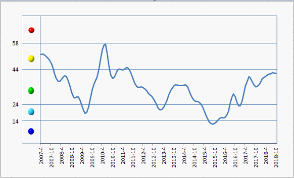 中色钨钼行业月度景气指数监测结果显示,2018年10月,中色钨钼行业景气指数为40.93,继8月份开始已连续2个月回落,但依然运行在“正常”区间;先行合成指数为52.71,呈持续上涨态势。近13个月以来中色钨钼行业月度景气指数见表1。