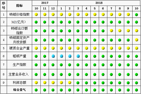 由中色钨钼行业月度景气信号灯(见图2)可见,2018年10月,在构成钨钼行业景气指数的9个指标中,钨钼出口额指数、钨钼固定资产月投资额、硬质合金产量3个指标处于“偏热”区间,钨钼价格指数、M2、粗钢产量、生产指数、钨钼企业主营业务收入、钨钼企业利润总额6个指标处于“正常”区间,没有处于“过冷”、“偏冷”、“过热”区间的指标。值得注意的是,钨钼价格指数从今年3月份开始下降,10月份为钨钼价格指数为68.25,已处于“正常”区间;本月,钨钼固定资产投资额指数首次进入“偏热”区间,具体值为160.25。已