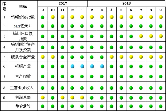 4、综合景气指数反映当前钨钼行业发展景气程度。景气灯号图把钨钼行业经济运行状态分为5个级别,“红灯”表示经济过热,“黄灯”表示经济偏热,“绿灯”表示经济运行正常,“浅蓝灯”表示经济偏冷,“蓝灯”表示经济过冷。对单项指标灯号赋予不同的权重,将其汇总而成的综合景气指数也同样由5个灯区显示。