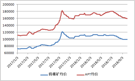 (1)价格走势:回顾3季度,APT冶炼厂陆续复产,自6月底开始,钨价格开始下跌,8月份延续了跌势,钨精矿方面,由于下游冶炼厂需求减少,使得钨精矿价格继续下跌,但由于环保等方面的因素,钨精矿成本仍然较高。2018年9月,国内钨精矿均价9.9万元/吨,同比下降14.4%;APT均价16.1万元/吨,同比下降7.7%。