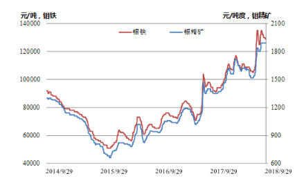 2018年第3季度,国内外钼市场总体呈现振荡回升的态势,国内走势相对平稳一些。具体来看,进入7月份,特别是下旬以来,国内钼产品价格加速上涨,目前部分钼产品价格已回升至2011年10月份以来的最高水平。2018年9月,国内钼精矿平均价格为1890元/吨度,同比上涨35.97%;钼铁均价为13.1万元/吨,同比上涨35.31%。