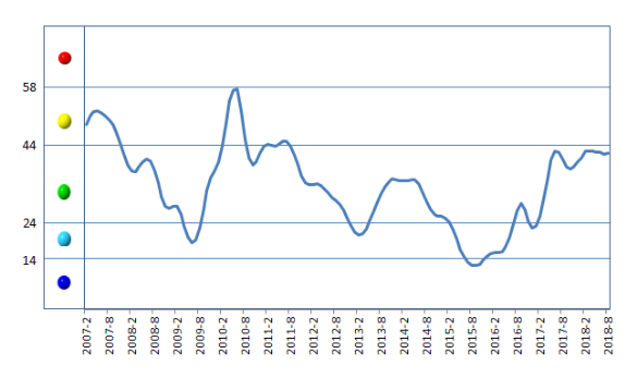 中色钨钼行业月度景气指数监测结果显示,2018年8月,中色钨钼行业景气指数为41.11,继4月开始连续下滑后出现回升,依然运行在“正常”空间;先行合成指数为49.16,继6月开始连续3个月下滑。近13个月以来中色钨钼行业月度景气指数见表1。