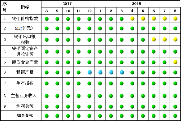 由中色钨钼行业月度景气信号灯(见图2)可见,2018年8月,在构成钨钼行业景气指数的9个指标中, M2、钨钼固定资产月投资额、粗钢产量、钨钼生产指数、钨钼企业主营业务收入、钨钼企业利润总额6个指标处于“正常”区间,钨钼价格指数、钨钼出口额、硬质合金产量3个指标处于“偏热”区间,没有处于“偏冷”“、过冷、“过热”空间的指标。