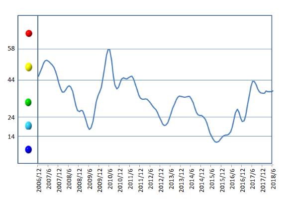 2018年6月,先行合成指数为43.62,比上月下降0.38点。中色钨钼行业合成指数趋势见图3。