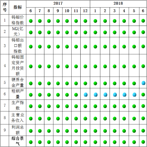 由中色钨钼行业月度景气信号灯(见图2)可见,2018年6月,在构成钨钼行业景气指数的9个指标中,钨钼价格指数、M2、钨钼出口额、钨钼固定资产月投资额、粗钢产量、钨钼生产指数、钨钼企业主营业务收入、钨钼企业利润总额8个指标处于“正常”区间,硬质合金产量1个指标处于“偏冷”区间,没有处于“过冷”“、偏热”、“过热”空间的指标。