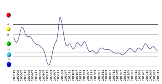 2018年11月,中色铜产业月度景气指数为31.7,较上月下降0.1个点,位于“正常”区间运行;先行合成指数为86.8,较上月上升0.4个点;一致合成指数为52.4,较上月上升0.7个点(近13个月铜产业月度景气指数如表1所示)。中色铜产业月度景气指数监测结果显示,铜产业景气指数有所回落,目前位于“正常”区间下沿运行。13个月来中色铜产业月度景气指数变化情况,详见表1