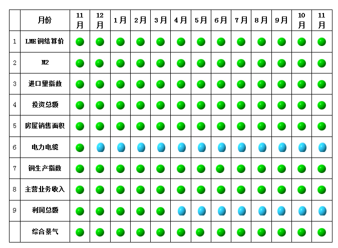 由中色铜产业月度景气信号灯可见(见图2),2018年11,在构成中色铜产业月度景气指数的9个指标中,LME铜结算价、M2、进口量指数、投资总额、房屋销售面积、铜生产指数、主营业务收入7个指标位于“正常”区间;电力电缆、利润总额2个指标位于“偏冷”区间。