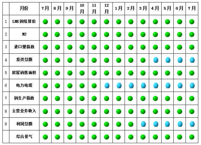 4、综合景气指数反映当前铜产业发展景气程度。景气灯号图把铜产业经济运行状态分为5个级别,“红灯”表示经济过热,“黄灯”表示经济偏热,“绿灯”表示经济运行正常,“浅蓝灯”表示经济偏冷,“蓝灯”表示经济过冷。对单项指标灯号赋予不同的权重,将其汇总而成的综合景气指数也同样由5个灯区显示。