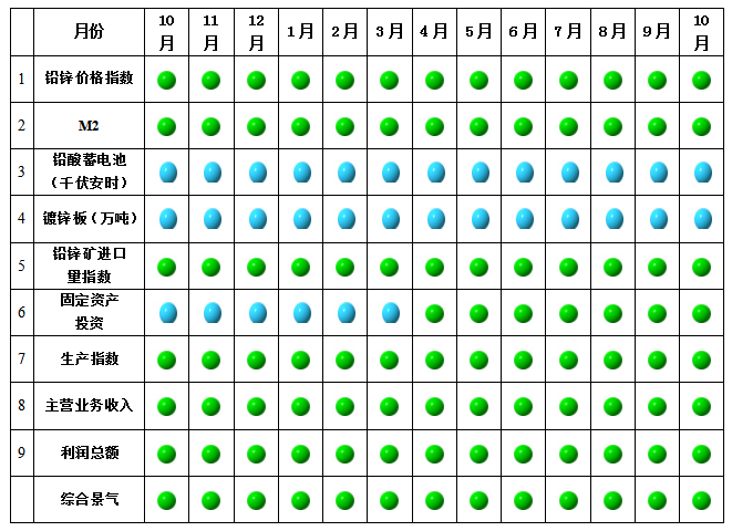 4、综合景气指数反映当前铅锌产业发展景气程度。景气灯号图把铅锌产业经济运行状态分为5个级别,“红灯”表示经济过热,“黄灯”表示经济偏热,“绿灯”表示经济运行正常,“浅蓝灯”表示经济偏冷,“蓝灯”表示经济过冷。对单项指标灯号赋予不同的权重,将其汇总而成的综合景气指数也同样由5个灯区显示。