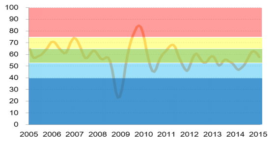 4、综合景气指数反映当前铝冶炼产业发展景气程度。景气灯号图把铝冶炼产业经济运行状态分为5个级别,“红灯”表示经济过热,“黄灯”表示经济偏热,“绿灯”表示经济运行正常,“浅蓝灯”表示经济偏冷,“蓝灯”表示经济过冷。对单项指标灯号赋予不同的权重,将其汇总而成的综合景气指数也同样由5个灯区显示。