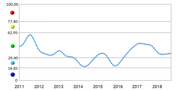 中色铝冶炼产业月度景气指数显示,2018年以来,景气指数始终处于“正常”区间下部调整,继二季度以来逐月回升,但涨幅有所收窄,9月份景气指数为35.1,环比回升0.1点。中色铝冶炼产业月度景气指数走势见图1。