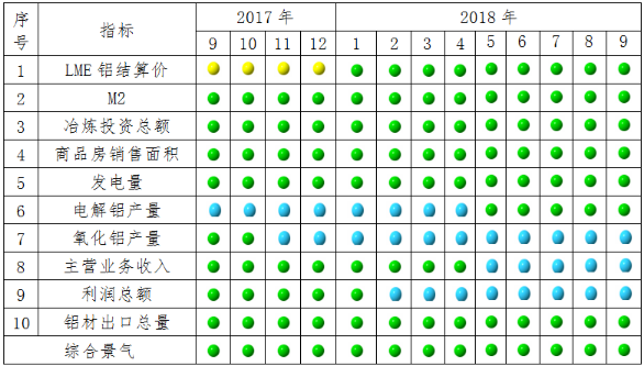 由中色铝冶炼产业景气信号灯(见表2)可见,2018年9月份,在构成铝冶炼产业景气指数的10个指标中,氧化铝产量、主营业务收入、利润总额等3个指标处于“偏冷”区间;LME铝结算价、M2、铝冶炼投资总额、商品房销售面积、发电量、电解铝产量、铝材出口总量等7个指标处于“正常”区间。