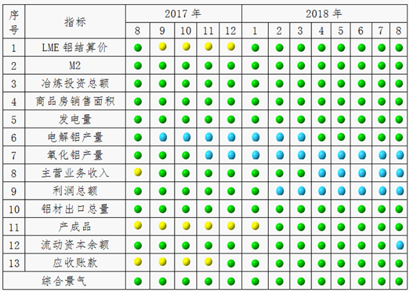 由中色铝冶炼产业景气信号灯(见表2)可见,2018年8月份,在构成铝冶炼产业景气指数的13个指标中,氧化铝产量、主营业务收入、利润总额和流动资本余额等4个指标处于“偏冷”区间;LME铝结算价、M2、铝冶炼投资总额、商品房销售面积、发电量、电解铝产量、铝材出口总量、产成品和应收账款等9个指标处于“正常”区间。