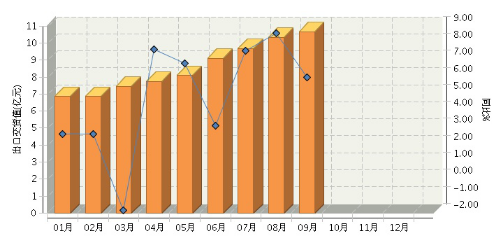 9月份,纸和纸板容器制造行业规模以上企业完成出口交货值10.67亿元,同比增长5.99%。较5月份下降2.57个百分点(见图3)。1月-9月,完成出口交货值81.18亿元,同比增长6.94%。全国纸和纸板容器制造行业连续三年月度出口交货值对比见图4。