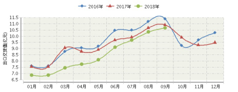 图4 2018年全国纸和纸板容器制造行业连续三年月度出口交货值对比