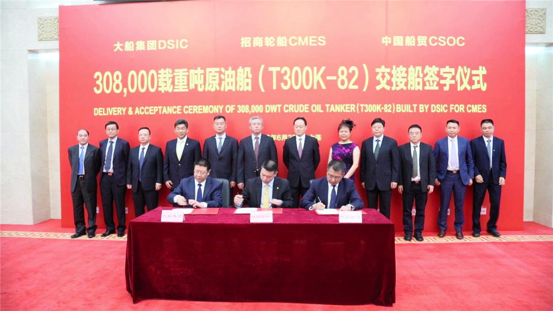 6月22日,中船重工大船集团为招商轮船建造的全球首艘30.8万吨超大型智能原油船(VLCC)“凱征”轮在大连成功交付。招商轮船、大船集团与中国船贸三方代表在交接船证书上签字。