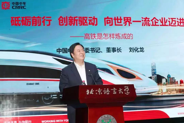 报告会上,刘化龙围绕“高铁、中车、创新、责任”四个关键词,从亮丽的国家名片、高铁的前世今生、艰苦的创新之路、驶向世界的中车、打造命运共同体五个方面,向大家讲述中国高铁是怎样炼成的,讲述中国中车作为高铁“锻造者”的发展史、创新史、以及中车站在新的历史起点的愿景和使命。