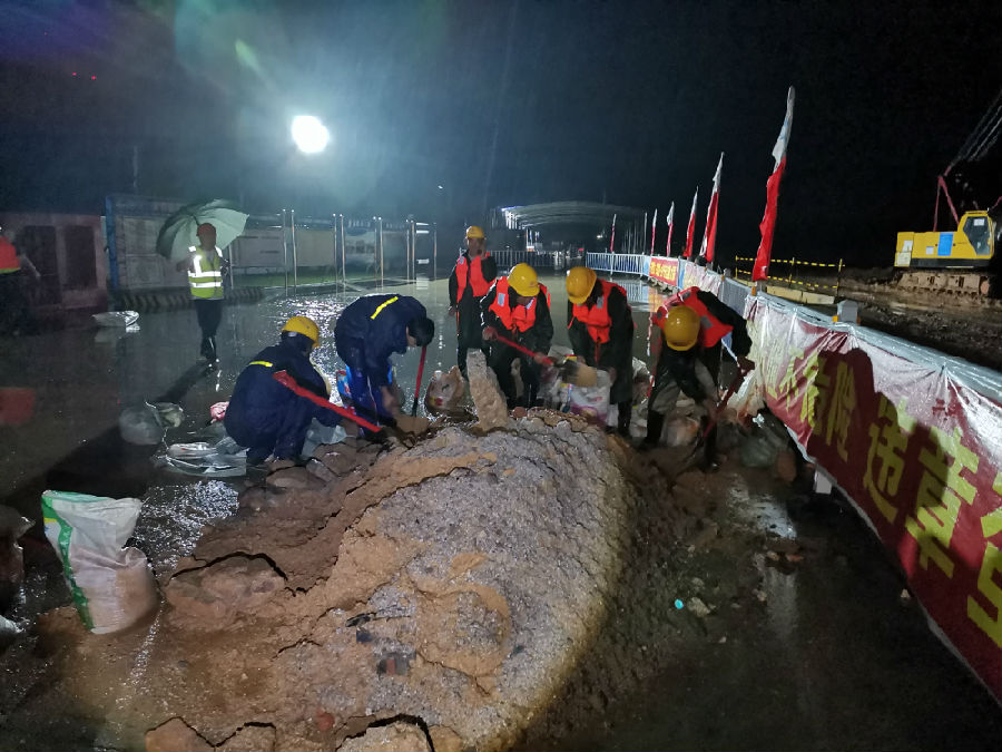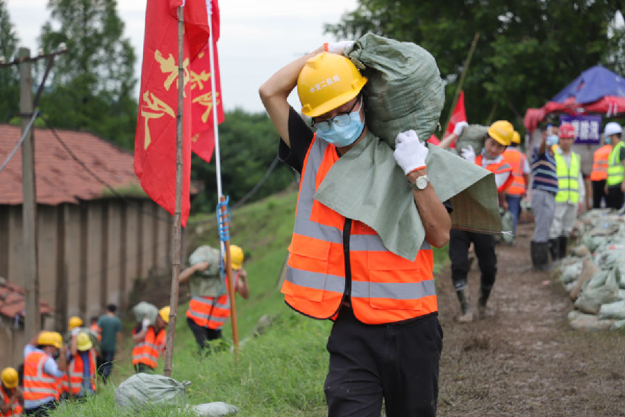 中交二航局组织506人对武汉朱家河沿岸约两公里的河堤进行加固加高。