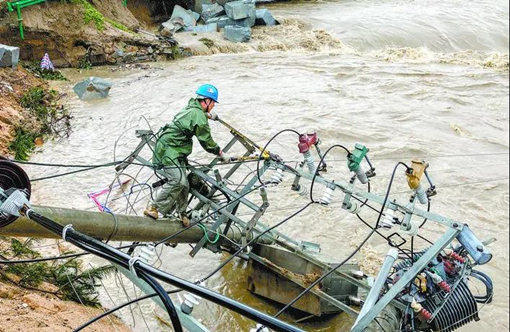 国网浙江江山市供电公司员工在峡口镇东坑村扶正被洪水冲倒的电杆。