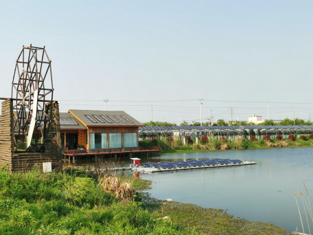 该电站由生态光伏与渔业光伏两个项目组成。光伏区组件采用钢支架和桩基架高方式安装,给予组件下方足够光照,并在充分利用太阳能资源发电的同时,在光伏组件下方空间进行大闸蟹、小龙虾、渔业养殖,小麦、水稻、蔬菜种植,散养家禽等。光伏区内禁止使用农药,以绿色、环保、健康为亮点,打造农业、渔业示范基地,充分体现了尊重自然、融入自然,人与自然和谐共生的理念,推动发展绿色环保光伏产业。