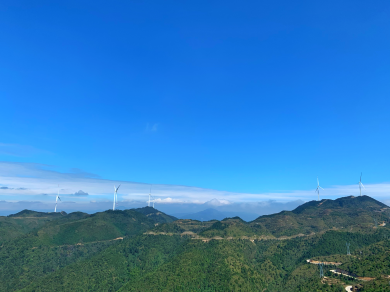 中核汇能富川风电场,39台不同容量的风力发电机组错落有致地坐落在30余平方公里的连绵丘陵上。作为中核集团在桂的第一个新能源发电项目,严格执行环境保护“三同时”,即建设项目中防治污染的措施,必须与主体工程同时设计、同时施工、同时投产的工作原则。