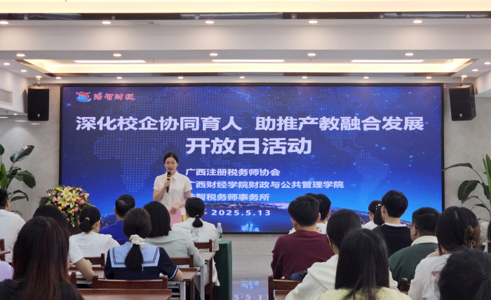5月13日,广西税协联合浩智税务师事务所、广西财经学院财政与公共管理学院组织举办了以“深化校企协同育人 助推产教融合发展”为主题的税务师事务所“开放日”活动。广西税协副秘书长吕敏康、广西财经学院财政与公共管理学院分团委书记杨育、浩智税务师事务所总经理李展、党支部书记钟天宁等所领导以及来自广西财经学院财政与公共管理学院的40余名师生参加活动,零距离感受税务师事务所和税务师工作场景。