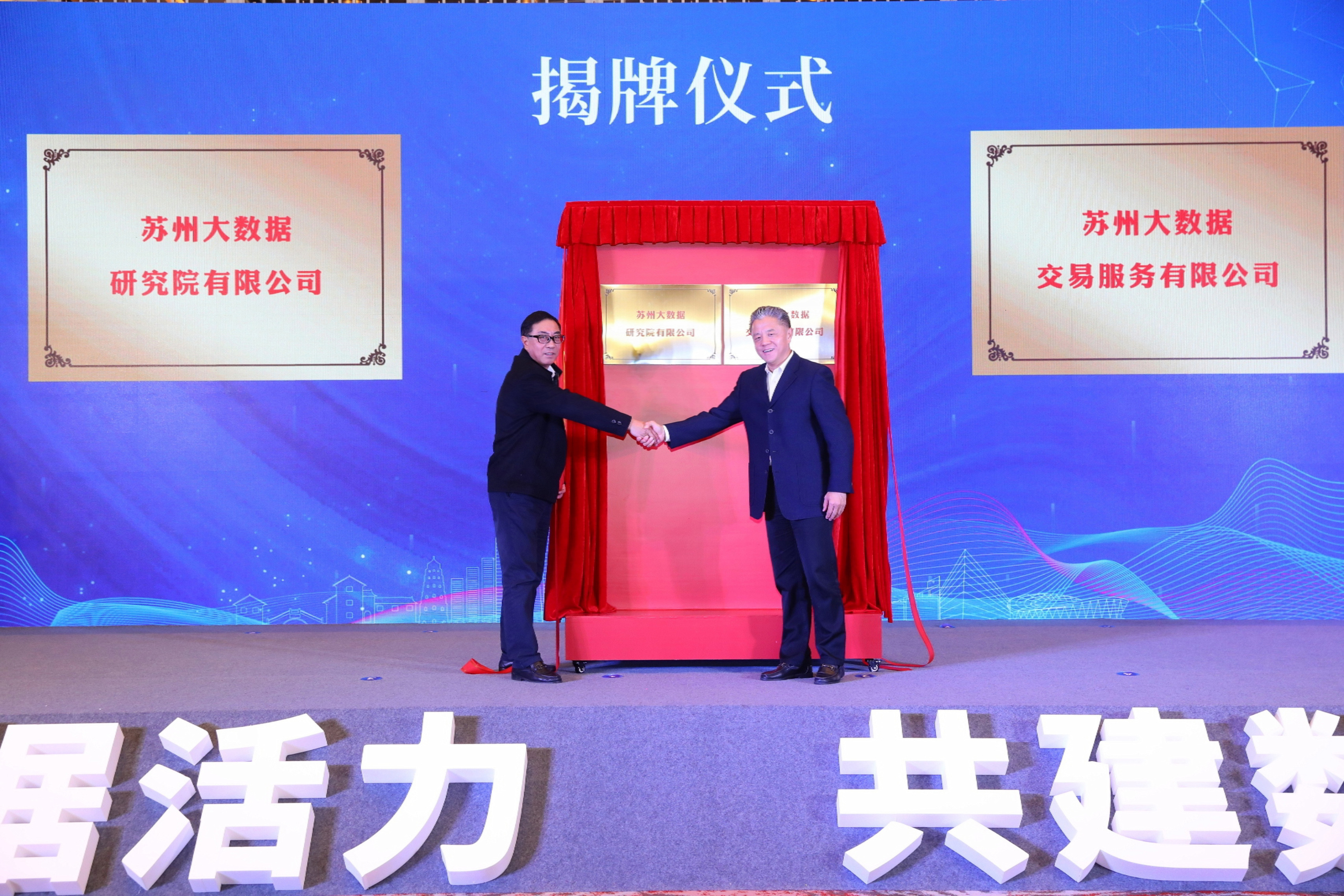 副市长杨知评,苏州国发集团党委书记、董事长、苏州大数据协会理事长黄建林共同为苏州大数据研究院有限公司、苏州大数据交易服务有限公司揭牌。