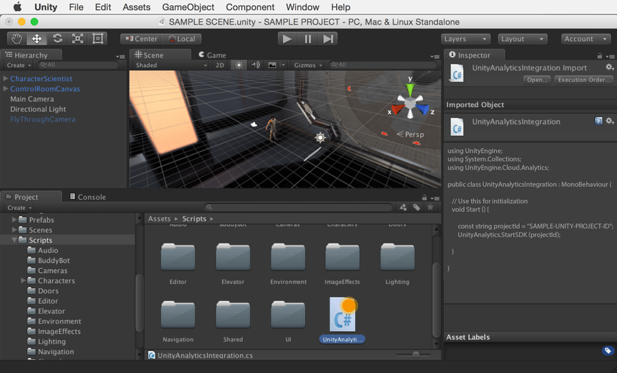 UnityAnalyticsIntegration 脚本可以附加到游戏中任何场景的任何游戏对象以便初始化 Unity Analytics SDK。建议将脚本附加到游戏的第一个__场景__中的__游戏对象__,从而确保开始捕获尽可能多的用户参与度数据。